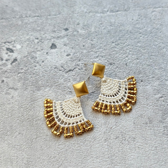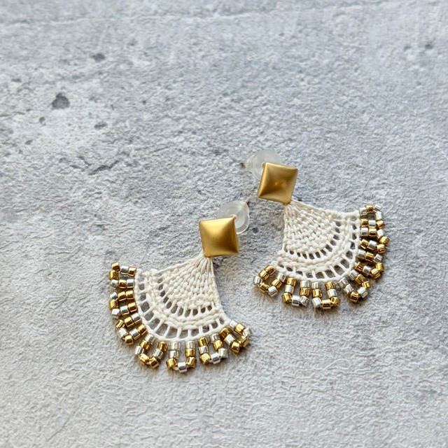 南米パラグアイの伝統工芸ニャンドゥティという美しいレース編みの技法で作った耳飾りです。 木枠に張った布に土台となる糸を張り、その土台の糸に針で機織りの様に横糸を渡したり、玉結びをして模様を作ります。 こちらはpuka定番の逆三角形デザインに、沢山付けたビーズがヒラヒラとレースの様に見えるところがポイントの耳飾りです。 糸で出来ているためとても軽いつけ心地です。 ピアスはフープピアスとキドニーフックピアスからお選びいただけます。 2枚目フープピアス3枚目キドニーフックピアスを参考にしてください。 繊細な作りの為、ラベル付きの箱に入れてのお渡しになるのでプレゼントにもおすすめです♡ 素材:レース糸、刺繍糸、ビーズ サイズ:ニャンドゥティ長さ2.5センチ、横約4センチ弱 ピアス:直径20mm 14kgf フープピアス 長さ約23mm 14kgfキドニーフックピアス イヤリング : 直径20mm フープイヤリング 【作品について】 ◎ 作品は全てハンドメイドとなります。ひとつひとつ丁寧にお作りしておりますが、多少のゆがみや個体差があることをご理解くださいます様お願いいたします。 ◎お使いの端末によっては色の見え方が実物とやや異なる場合があります。 自然光で撮影しており、実物に近いお色味で写真を掲載してはいますが、室内でご覧いただくと多少の相違がある場合もございますのでご了承ください。 【取扱いの注意】 ◎糸でできている為、出来る限り丈夫を心がけて密度の濃いものを制作しておりますが、とても繊細な作りの為、強い力を加えない様に気をつけてください。 ◎ 糸をボンドを薄めたもので固めています。糸を丈夫にして防水効果のある加工もしていますが、水に濡れると形崩れする場合がありますので水に濡らさない様に気をつけて下さい。 ◎保管をする際は色褪せや湿気を避けるためにパッケージボックスに入れて保管する等して、陽の当たる場所や、形状を保つために湿度の強い場所を避けて保管してください。