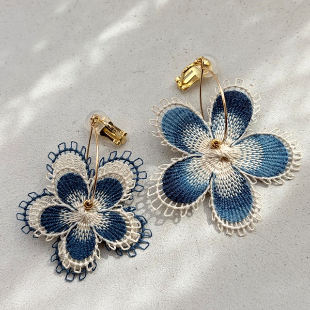 南米パラグアイの伝統工芸"ニャンドゥティ"というレース編みの技法で作ったグラデーションが美しいピアスです☆ 木枠に張った布に土台となる糸を縫って張り、その土台の糸に機織りの様にひと針ひと針編み込んで模様を作っています。 糸は青梅市にある藍染工房に綛糸を持参して藍染させていただいた糸を使用しています。 江戸時代を中心に行われていた天然藍灰汁発酵建てという化学薬品を一切使わず自然界から取れる原料のみを用いて染める、身体にも環境にも優しい方法で染めました。 インディゴブルーが目を引く人気アイテムです。 大ぶりのお花ですが糸で出来ているためとても軽いつけ心地のピアスです。 アシンメトリーなお花はフープに通してあり、くるくる回ってユニークなデザインとなっています◎ 繊細な作りの為、ラベル付きの箱に入れてのお渡しになるのでプレゼントにもおすすめです◎ 素材: 本藍染糸、レース糸 サイズ:ニャンドゥティ 1枚の方約5cm×5cm、2枚の方 大4.5cm×4.5cm、小3.5cm×3.5cm 全体の長さ:片方6cm 片方5.5cm ピアス金具:14kgfポストピアス イヤリング金具:クリップイヤリングソフトタイプ 《取り扱い上の注意》 糸をボンドを薄めたもので固めているため水に濡れると形崩れする場合がありますので水に濡らさない様に気をつけて下さい。 軽いので外れた時に気付きにくいので引っかかり等に気をつけて下さい。 《返品返金について》 違う作品の場合、欠陥のある作品の場合のみになります。