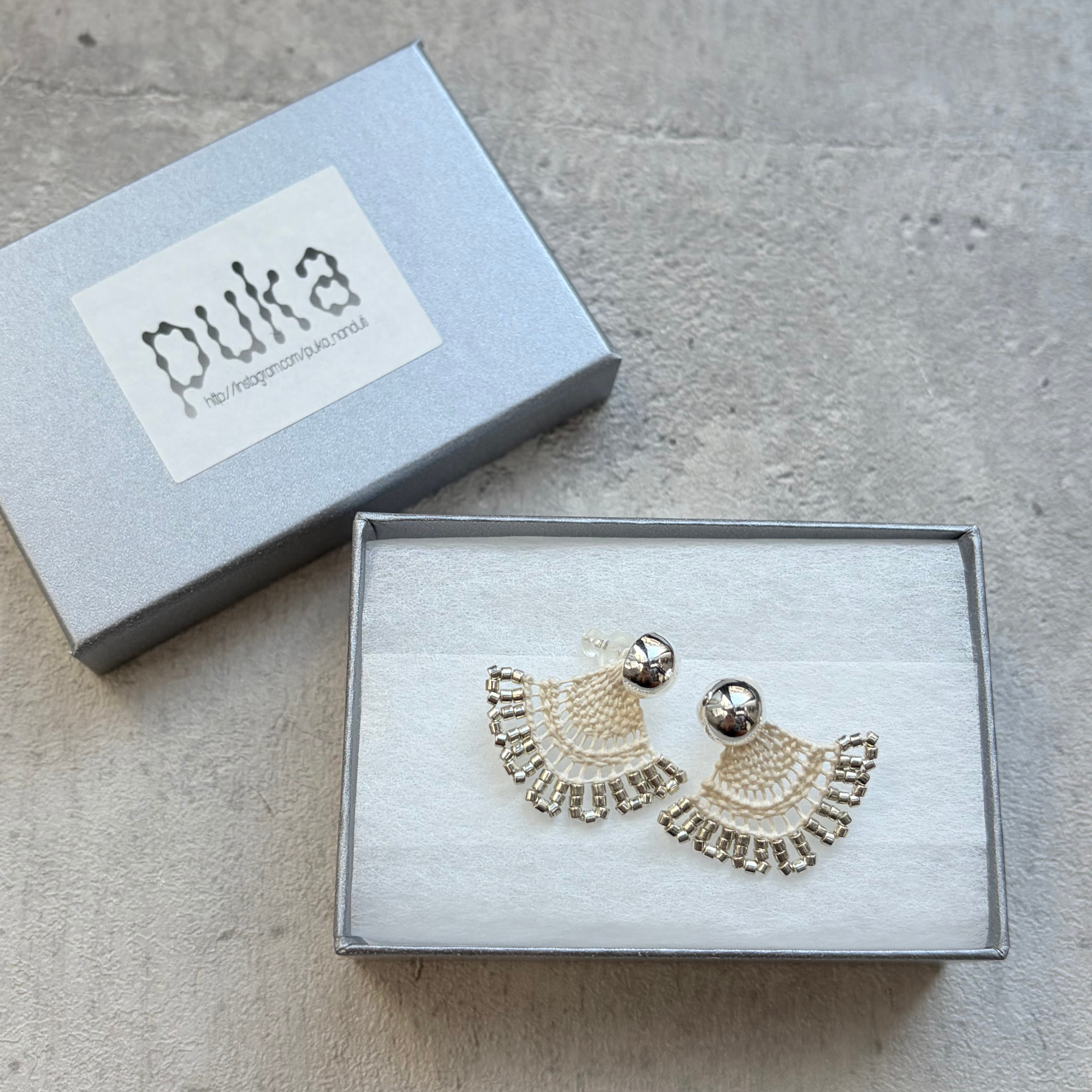 こちらはビーズをあしらった小さい扇型のニャンドゥティpuka model miniの耳飾りです。
