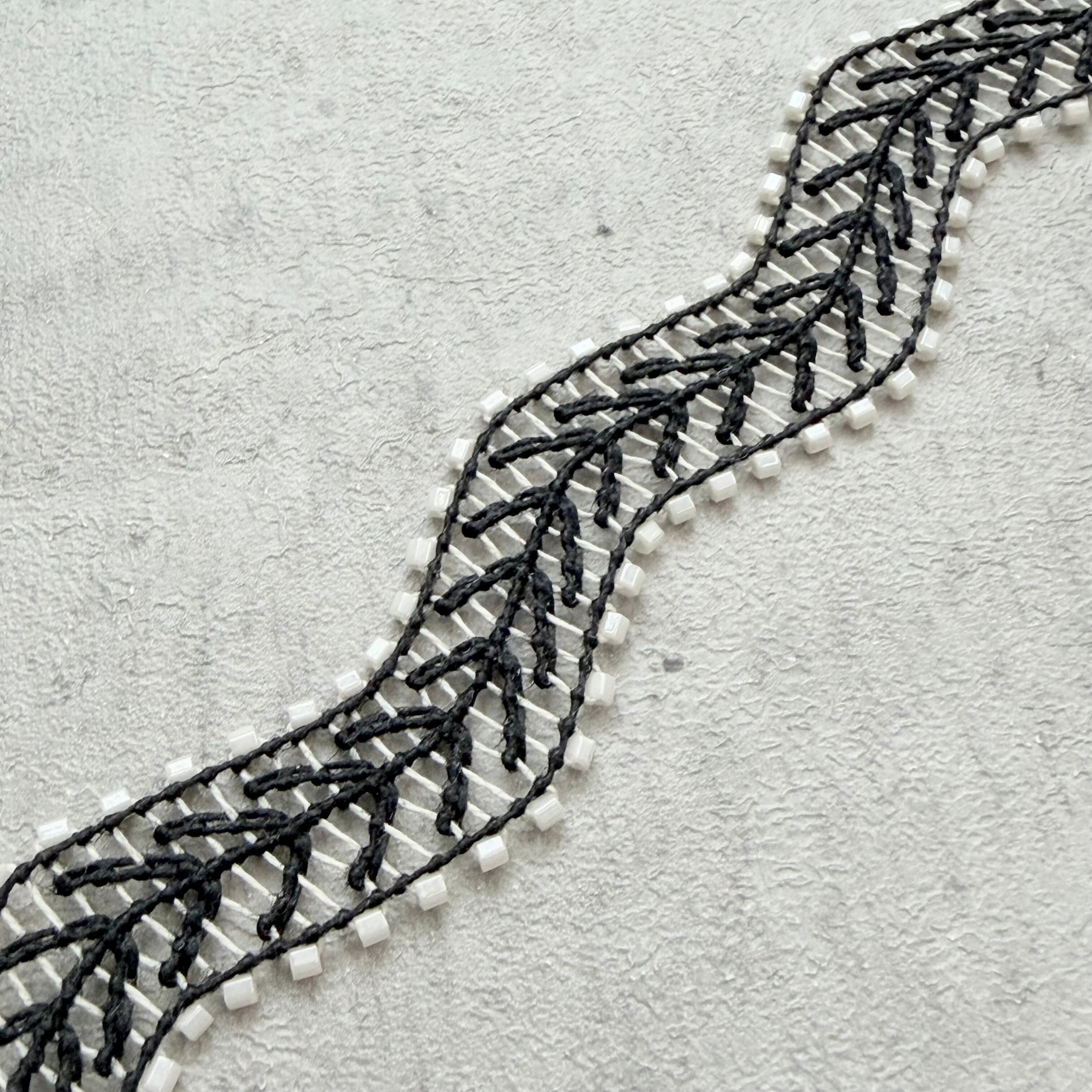 こちらはナミナミのアウトラインにニャンドゥティの伝統的なモチーフであるローズマリーの枝の模様を編み上げました。