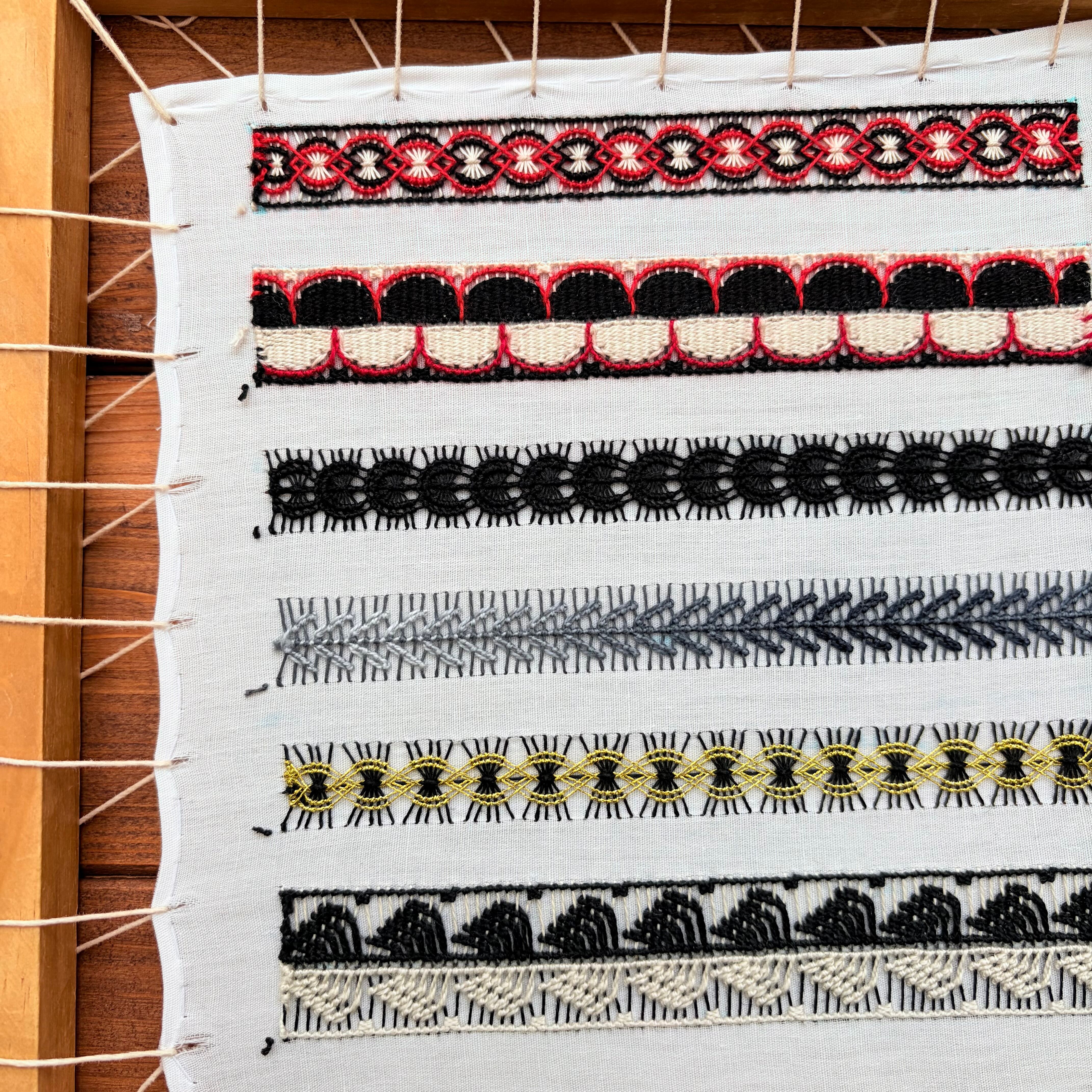 木枠に張った布に土台となる糸を張り、その土台の糸に針で機織りの様に横糸を渡したり玉結びをして模様を作り、最後に布と糸を切り離しレースの状態にする、アナログな課程を経て仕上げています。