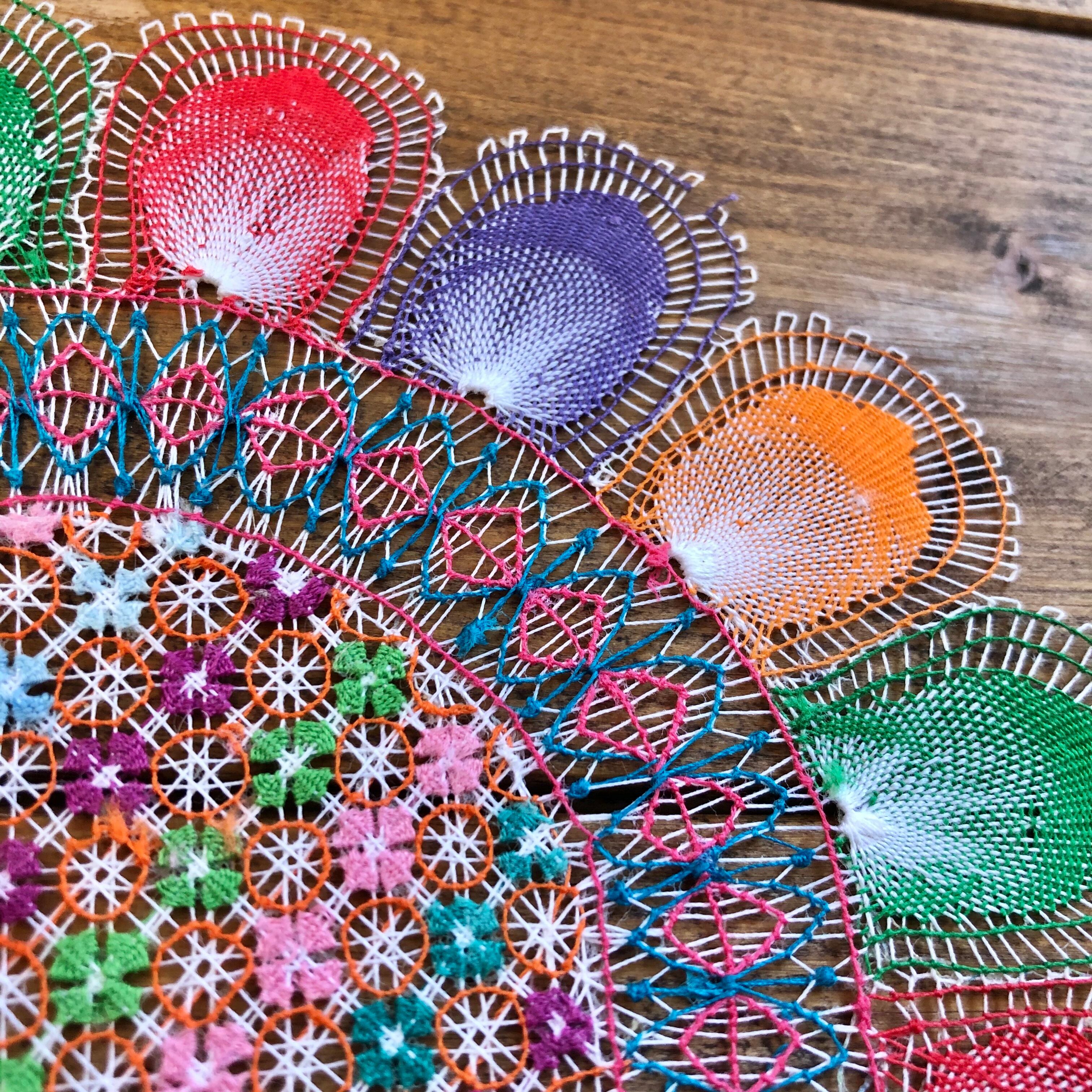 とても繊細で南米らしいカラフルな色使いが特徴の可愛いらしくもあり美しいドイリーです。