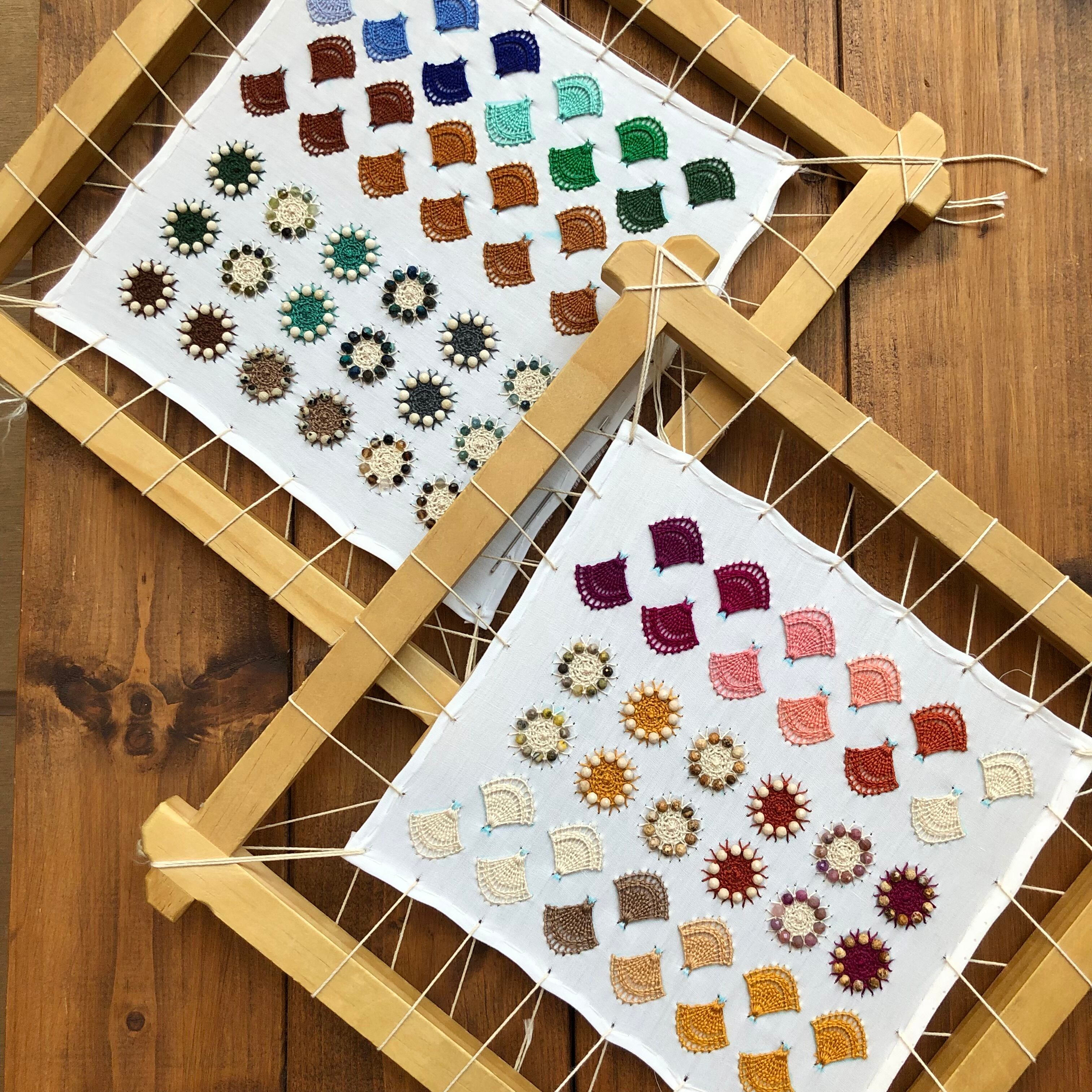 木枠に張った布に土台となる糸を縫って張り、その土台の糸に針で機織りの様に糸を通したり、玉結びをして模様を作り、最後に布を切り離して糸だけ残しレースの状態にします。