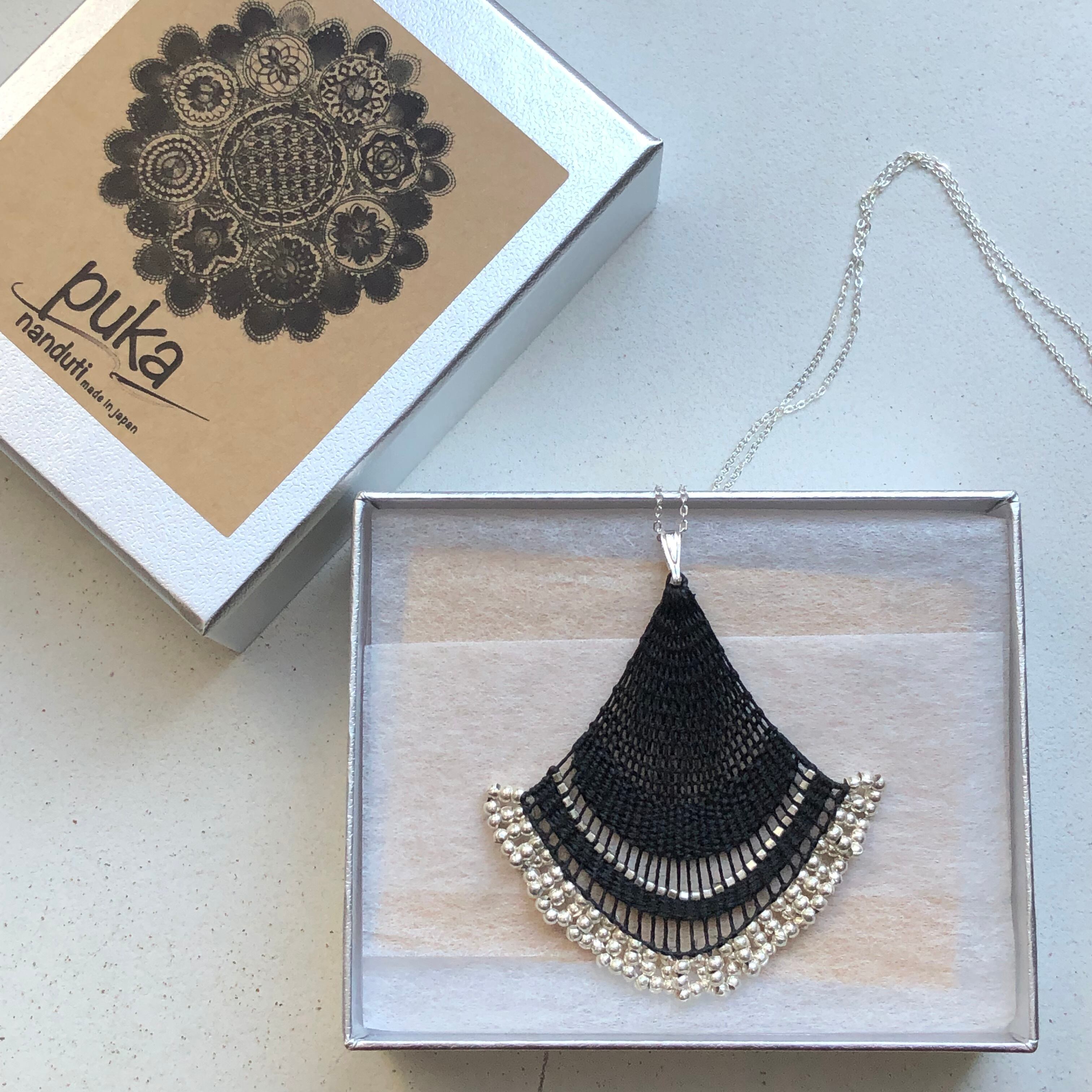 様に横糸を通してできあがるグラデーションが美しいデザインで、裾にカレンシルバーのビーズを沢山あしらい、ブラックにシルバーが良く映えるニャンドゥティのネックレスです。